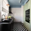Kuchnia miała być tłem dla salonu. Czarna, kompaktowa zabudowa Ikea z ceramicznymi uchwytami stanowi elegancki kontrast dla szachownicy na posadzce, nawiązującej do willowych wnętrz z międzywojennego Sulejówka. Wysoka zabudowa, z frezowanymi frontami w klimacie retro, koresponduje kolorystycznie z zasłonami, ocieplając całość i nadając domowego charakteru.