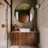 Ta niezwykle kojąca i pełna głębi barwa wnosi do przestrzeni elegancję porównywalną z czernią, lecz w znacznie bardziej przystępny, niezobowiązujący sposób. Dodatkowo tworzy ,,miękkie”, bardziej harmonijne połączenia z innymi kolorami. W tej realizacji architekci zestawili brąz ze zgaszoną zielenią, a ten piękny duet dopełnili kroplą szlachetnego bordo – odcienia, które również zyskuje na popularności. Wysublimowany charakter dopełniają starannie dobrane materiały: kamień, drewno, skóra i szkło.